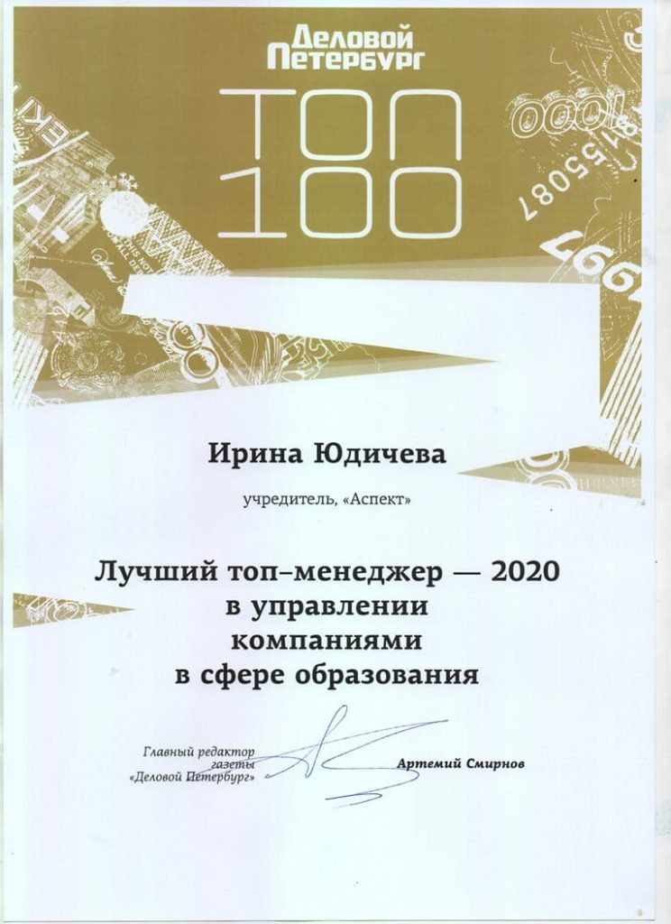 Основатель международного образовательного центра “АСПЕКТ” Ирина Юдичева вошла в число 100 самых эффективных менеджеров Петербурга и Ленобласти по версии издания “Деловой Петербург”